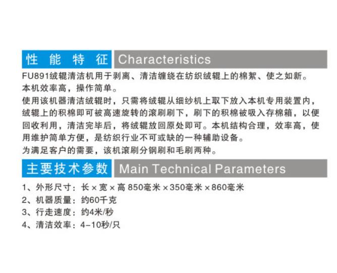 使用該機(jī)器清潔絨輥時,只需將絨輥從細(xì)紗機(jī)上取下放入本機(jī)專用裝置內(nèi),絨輥上的積棉即可被高速旋轉(zhuǎn)的滾刷刷下,刷下的積棉被吸入存棉箱,以便回收利用,清潔完畢后,將絨輥放回原處即可。本機(jī)結(jié)構(gòu)合理,效率高,使用維護(hù)簡單方便,是紡織行業(yè)************的一種輔助設(shè)備。